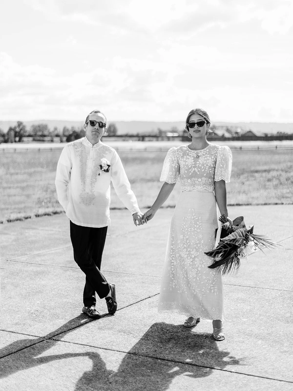 Hosted inside the open hangar, their wedding blended Filipino heritage with a simple but significant design approach. Lush tropical elements and island references nodded to the bride’s roots overseas, while the architecture and history of the venue remained central, framing the celebration without overpowering it. The result felt like a modern international terminal softened by botanicals and light, vibrant and welcoming, where family gathered easily, lingered longer, and shared the day the way they would a long table meal passed from hand to hand.
