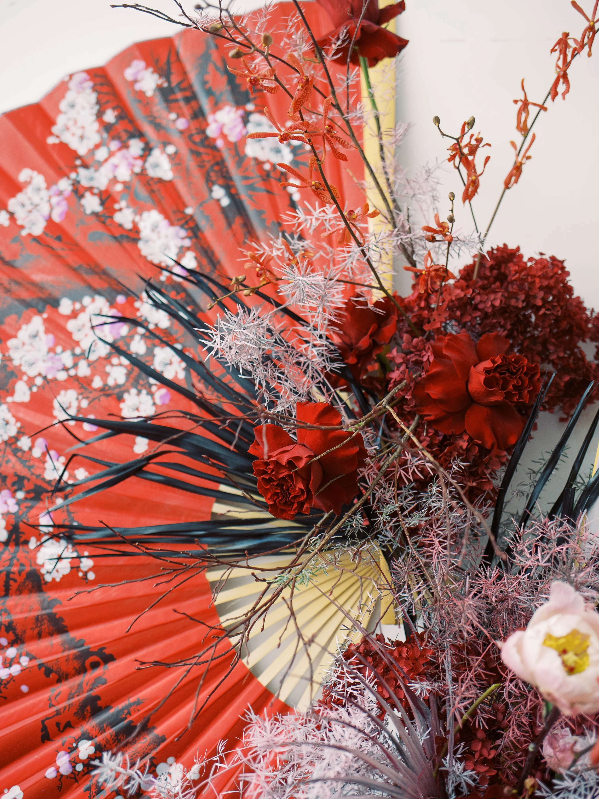 Floral Designer Katherine installed three Chinese fans at varying height and depth accompanied by both painted and natural floral to create texture, nuance, and interest for the eye.